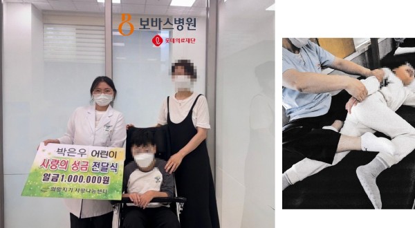 25925일 목요일 <보바스병원>에서 <박은우 어린이(가명)>가정에 사랑의 성금을 전달하였습니다. 박은우(가명) 어린이는 현재 강직성 양마비성 뇌성마비로 치료 중에 있습니다. 은우는 태아 25, 몸무게 780g의 미숙아로 출생하게 되었습니다. 출생 시 뇌 영상검사를 했는데 뇌실주위 백질연화증 소견이 확인되었습니다. 환아는 안타깝게도 뇌출혈과 동시에 동맥개관증, 패혈증, 호흡곤란, 미숙아망막증, 탈장, 잠복고환 등 많은 증상들이 나타나며 상사를 오가게 되었습니다. 신생아 집중치료실에서 치료를 받으며 생후 4개월 만에 인큐베이터에서 나올 수 있었지만 머리에는 션트를, 발가락에는 맥박과 호흡을 체크하는 기기와 산소발생기를 달고 겨우 집으로 돌아올 수 있었습니다. 다행히 자라면서 자가 호흡이 가능해져서 산소발생기 및 맥박/호흡측정기를 뗄 수 있었지만 심각한 뇌손상으로 인한 상세불명의 뇌전증 지속이라는 진단을 받게 되었습니다. 뇌손상이 심한 환아는 상하지 강직성 마비가 심한 편이고 특히 좌뇌 손상이 더 커서 오른쪽의 기능이상이 심해 오른손을 사용하지 못하고 오른쪽 귀는 중도난청으로 보청기가 필요한 상황입니다. 또한 뇌손상으로 인해 안구진탕과 시지각 정보처리 능력이 떨어져서 시각적인 정보를 인식하는 데 많은 어려움이 있고 미숙아망막증 수술로 시야범위가 좁고 고도근시(-20)로 두꺼운 안경을 쓰고 있어 일상생활을 하는데 불편함이 있습니다. 아이가 성장함에 따라 강직도 심해져서 4년 전에는 강직을 완화해주는 SDR<뇌성마비 등 신경계 질환으로 인한 강직(근육이 뻣뻣해지는 증상) 환자에게 시행되는 수술로, 비정상적인 신경 신호를 차단해 까치발 등 강직을 완화하는 것이 목적>수술을 받았습니다. 강직이 많이 빠져서 근력을 키우는 재활치료가 필요했지만 잦은 대발작으로 치료를 받지 못하다가 다행히 23년부터 치료를 꾸준히 할 수 있게 되었습니다. 재활치료로 근력이 많이 생기고 있지만 실비보험이 없어 경제적인 부담이 가중되고 있습니다. 또한 작년 9월 션트 제거수술을 하였고 고관절 탈구로 고관절 수술도 예정되어 있습니다. 병원 진료, 검사비, 재활치료비 등 지속적으로 의료비가 발생하는 상황에서 실비보험이 없어 수술비 및 치료비 부담에 커지고 있는 은우 가정에 사랑의 성금을 전달하였습니다. 지속적인 치료로 은우가 빨리 걷는 날이 오기를 우리 모두가 응원합니다.