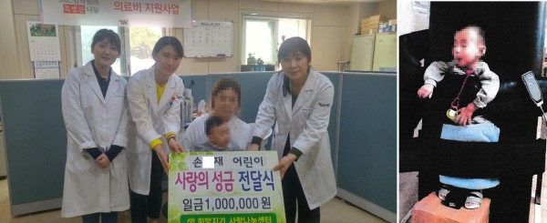 19925일 수요일 <SRC재활병원>에서 사랑의 성금 전달식이 있었습니다. 이번에 성금을 전달하게 된 가정은 <손O재 어린이>가정입니다. 환아는 태아 검사 때 뇌가 작고 심실중격결손이 보인다는 소견을 듣게 되었습니다. 출생 당시 얼굴생김새이상, 선천성 심장기형, 요도하혈, 난청이 발견되어 대형병원에서 염색체 검사를 시행한 결과 3번 염색체 장완의 부분 결실을 진단 받았습니다. 출생 후 항문기형에 대한 수술 후 신생아집중치료실에서 40일간 치료를 받고 탈장수술을 2, 심장수술까지 큰 수술을 여러 차례 견뎌내야 했습니다. 염색체변이와 그로인한 댄디워커증후군(선천기형, 변형 및 염색체 이상), 생김새이상, 척추측만, 청력이상, 다리뼈가 휘어지고, 날개뼈가 굳고...의사선생님께서는 평생 재활을 해도 정상적으로 생활하는 것이 힘들다는 말에 어머니는 왜 이런 가혹함을 주시는지 너무 속상했다고 합니다. 생후 6개월부터 재활치료를 시작하여 입퇴원을 반복하며 포기하지 않고 재활치료를 해온 결과 생후 19개월 만에 콧줄을 제거하고 조금씩 기기도 하고 웃음도 많아졌다고 합니다. 재활치료비가 부족하여 재활운동을 받지 못할 때도 많지만 <희망지기 사랑나눔센터>의 일백만원 치료비 지원사업으로 재활치료를 꾸준히 이어나갈 수 있도록 어린이 가정에 작은 희망이 되길 바랍니다.