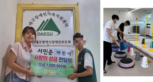 25825일 월요일 <대구장애인가족지원센터>에서 <서민준(가명) 어린이>가정에 사랑의 성금을 전달하였습니다. 서민준 (가명)어린이는 현재 지적장애 중증ADHD로 치료 중에 있습니다. 환아는 대구에 위치한 곽호순병원과 이룸특수발달지원센터에서 치료를 받고 있습니다. 환아는 4살 때 어린이집에 다니면서부터 또래 관계가 원만하지 않고 언어발달이 느려 언어치료를 받게 되었습니다. 그 후 대학병원에서 발달검사 결과 지적장애라는 병명을 진단받게 되었습니다. 동시에 ADHD증상도 나타나 6개월 간 약물을 복용하였으나 약물에 대한 거부감과 약물복용 후 식사를 제대로 하지 않고 힘이 없는 모습을 보여 의사와 상의 없이 복용을 중단하고 병원을 가지 않게 되었습니다. 그러나 성장할수록 증상은 더욱 심해졌고 초등학교 4학년으로 진급한 시점에 아동의 산만함으로 인해 학교수업진행에 어려움이 생겨 담임교사의 권유로 검사를 다시 받게 되었습니다. 그래서 ADHD 진단으로 약물치료를 다시 시작하게 되었습니다. 아동은 고학년으로 진학하면서 또래와의 발달수준의 격차가 커지게 되고 상호작용이 힘들어 학교생활 적응에 어려움이 많습니다. 이에 특수학교로 전학하고자 했으나 당시 자리가 없어 전학을 결정할 수 없었습니다. 아동의 도전적인 행동과 공상행동으로 남동생과의 갈등이 깊어 분리를 결정하고 남동생이 다른 학교로 전학을 가는 등 여러 가지 상황이 발생되고 있습니다. 이후 아동은 ADHD 증상과 지적장애 정도 완화를 위해 발달재활바우처를 통해 특수발달지원센터에서 주 4회 이상 행동치료를 받으며 재활을 병행하고 있습니다. 그러나 현재까지 아동은 혼잣말을 많이 하고 감정기복이 심하며, 공상(허공에 대고 이야기)하는 모습 등이 자주 관찰되어 학교생활 및 일상생활에 어려움을 겪고 있습니다. 이에 지속적인 치료와 의료적인 지원이 필요한 상황입니다. 아동은 사설치료실을 통해 언어, 인지, 심리, 미술치료를 받고 있으나 바우처 지원금을 사용해도 가정의 재활치료비 자부담이 발생되고 있습니다. 이로 인해 재활치료비가 가정의 부채로 더해지고 있는 상황입니다. 아동이 장기적인 치료를 통해 올바르게 성장, 발달하여 교우관계 및 학교와 일생생활에 잘 적응할 수 있도록 이번 성금을 전달하였습니다.